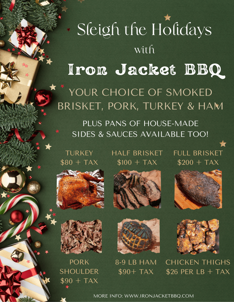 Looking to make your holiday meals a breeze and delicious? Iron Jacket BBQ has you covered for Christmas and New Year’s feasts with our mouthwatering meats and sides.